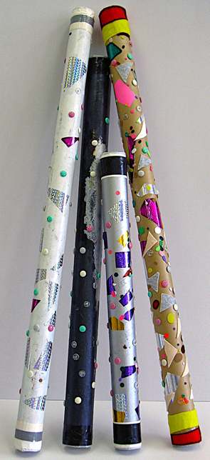 【教材の特徴】 この題材は、長さ1mほどの厚手の紙筒に木づちで釘を打ち込み、筒の中に米・小豆・大豆等を入れ、筒を傾けると内側に打ち込まれた釘に粒状の素材が当たり心地よい音を発する作品である。 【指導方法】 1. 制作する作品についてのイメージづくり 参考作品の鑑賞・使用する素材や用具の確認・完成までの制作プロセスの説明等を行い、興味関心を高める。 2. 固定用具の役割・使用方法・注意点の意識化 万力の特徴・構造・使い方を分かりやすく伝える。操作とともに言語で説明を加え、児童の記憶に残りやすくする(以後、毎時間個々に固定用具の取り付け・片付けに取り組ませる)。 3. 紙筒のデコレーション 気に入った長さ・太さの紙筒を選択させ、万力に固定しながらホイル折り紙で飾り付けをしたり、絵の具で着色したりさせる。 4. 釘打ち作業 筒を万力に固定し上敷き鋲を木づちでトントン打ち込ませる。鋲は親指・人差し指・中指でしっかり固定し、筒の真上に打ち込むよう説明する。上敷き鋲の頭に真っ直ぐ木づちを当てるよう指導し、筒の中に鋲が入り始めても可能な限り鋲を握り続けると曲がらずに打てることを伝える。筒の断面教材を使って釘の効果を確かめさせ、より多くの釘打ちに取り組ませる。上敷き鋲を80~100本程度打ったら、通常の釘の打ち込みにも挑戦させる。 5. 筒の端をふさぐ丸型テーブルクロスのカッティング・接着 デザインテープで描かれた丸型の輪郭に沿ってテーブルクロスをはさみでカットさせる(2枚)。筒を立てた状態で万力に固定し、片側の端に丸型にカットしたテーブルクロスを両面テープで接着させる。 6. 筒の中に入れる素材の選定・素材入れ 参考作品の音色をもとに気に入った素材を選ばせ、ロートを使って筒の中に入れるよう促す。音を確かめながら量を調整したり素材を変更したりして心地よい音色に近づけるよう指導する。 7. テーブルクロスで筒ふさぎ 筒のもう片方の端をテーブルクロスでふさぎ、テーブルクロスの接着部分をガムテープや装飾用テープで補強させる。 |