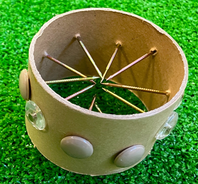 ■上敷き鋲の活用 釘打ちがしやすいよう通常の釘ではなく上敷き鋲を使用する。上敷き鋲の頭は直径1㎝程のプラスチック製で同サイズの釘に比べて触覚的に認知しやすく木づちで叩いた際に当たりやすいため、視覚障害児童に扱いやすい。 ■用具・材料の収納 使用中の用具や釘の収納にトレーや皿を活用し、作業中は用具を所定の場所に戻したり、保管したりして効率的に作業が進められるようにする。 ■固定用具の活用 筒を万力に固定し、両手指が自由に使える環境を保障する。これにより、児童が一人で触覚を活用して安全且つスムースに釘打ち作業に取り組むことができる。 ■触覚的な理解を促す教材の提示 筒の断面教材(筒の中で釘が密集している様子が分かるもの)を児童分作成し、指導の中で活用する。この教材を提供することによって、筒の中の粒状の素材が、打ち込まれた釘に当たって心地よい音を発する原理の理解を促すことができる。 |