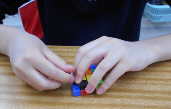 例)5年生算数 複雑な立体の体積を求める課題(凹のような形をした図形) リンキングキューブは、一方の突起を他方のくぼみに差し込んで繋げられる。事前に組み立てておいた立体図形を児童に提示し、点図と照らし合わせながら触察させる。 また、点図を触察した後に、児童自身がそれを立体に組み立てることで、より理解を深めることができる。 |