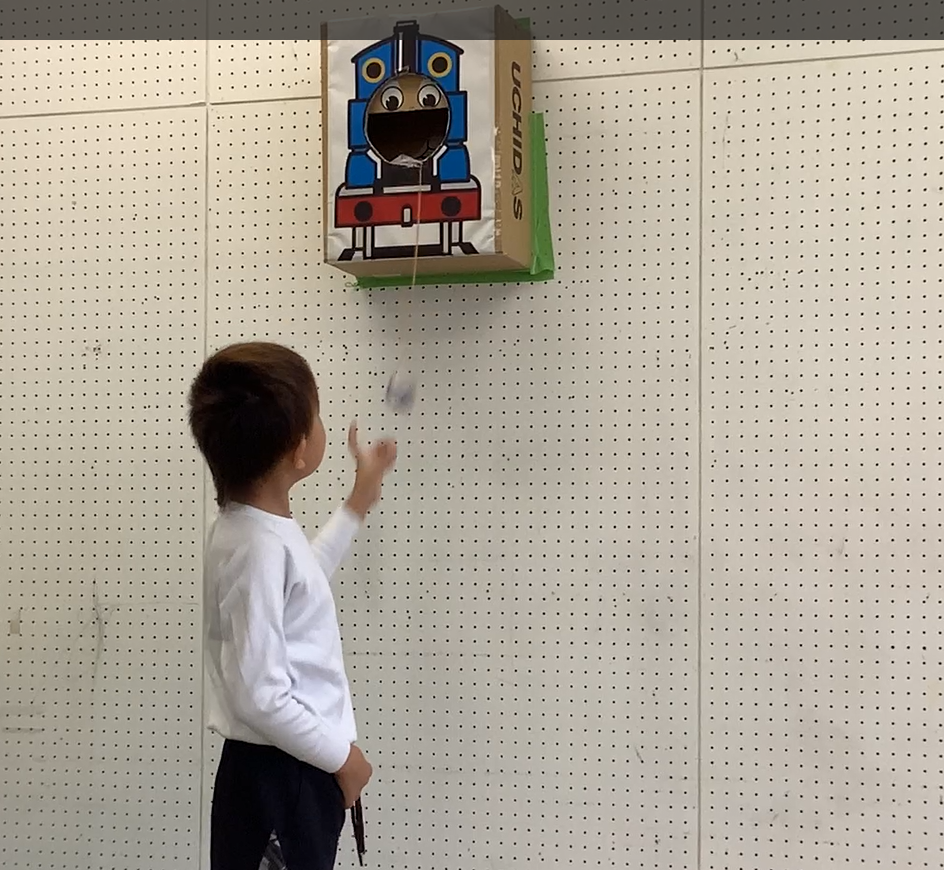・対象児が好むキャラクターを目標物にする。 ・手を伸ばしても届かない位置に玉を入れる箇所を設置する。 ・自由時間等に、いつでも触れることができるように壁に設置する。 |