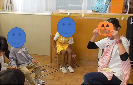 ・歌や手遊び歌を通して楽しい雰囲気の中、自然に教師の顔に注目を促すことができ、教師への意識を高めることができる。 ・写真はハロウィンバージョンになっているが、クリスマスなど季節や行事に合わせて歌詞と教材を変えることで、季節や行事に親しむことができる。 |