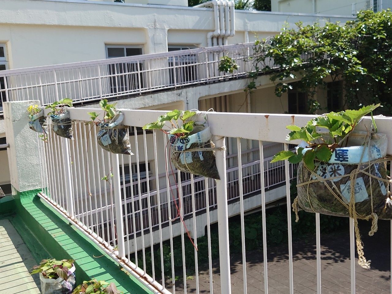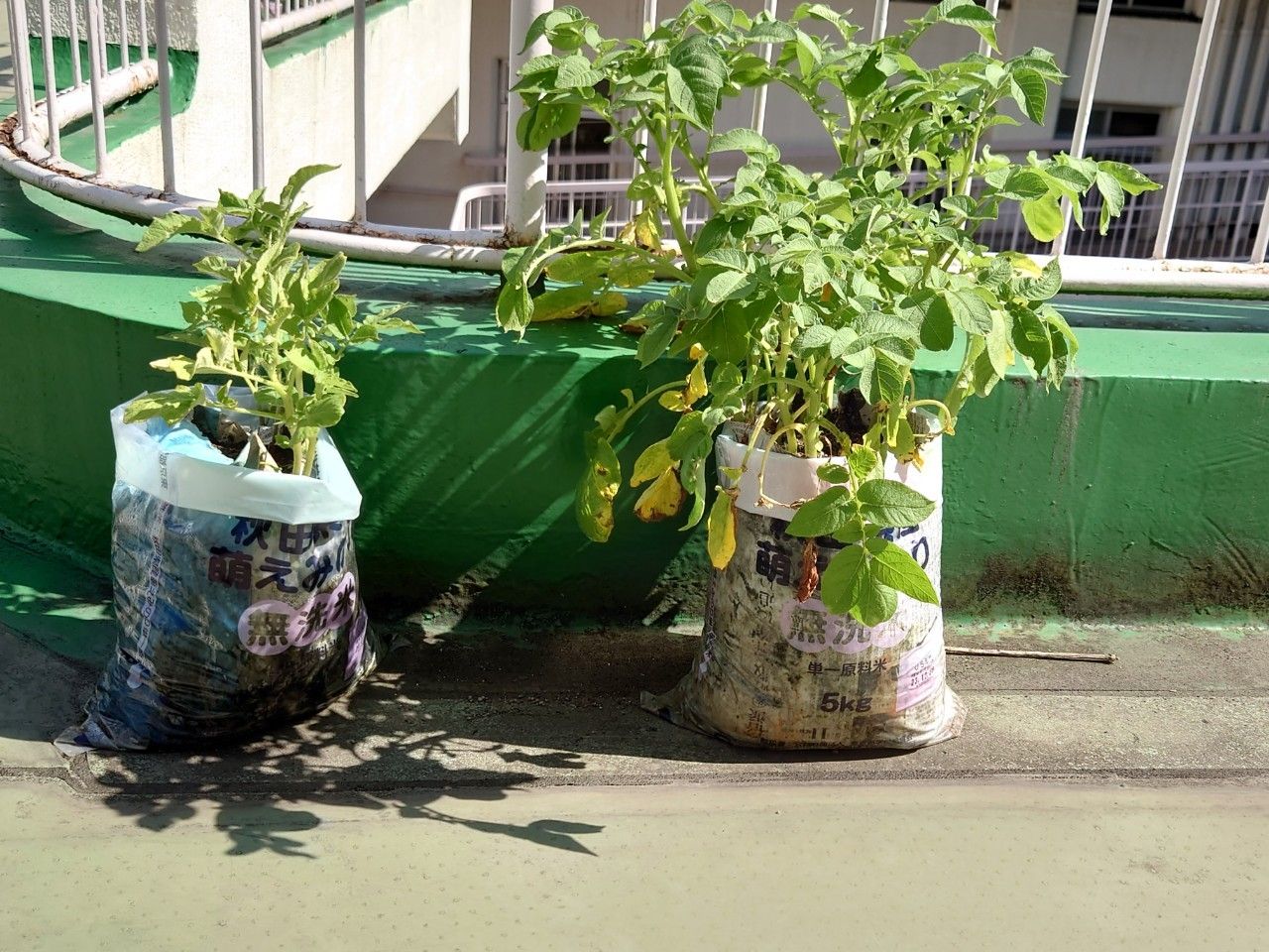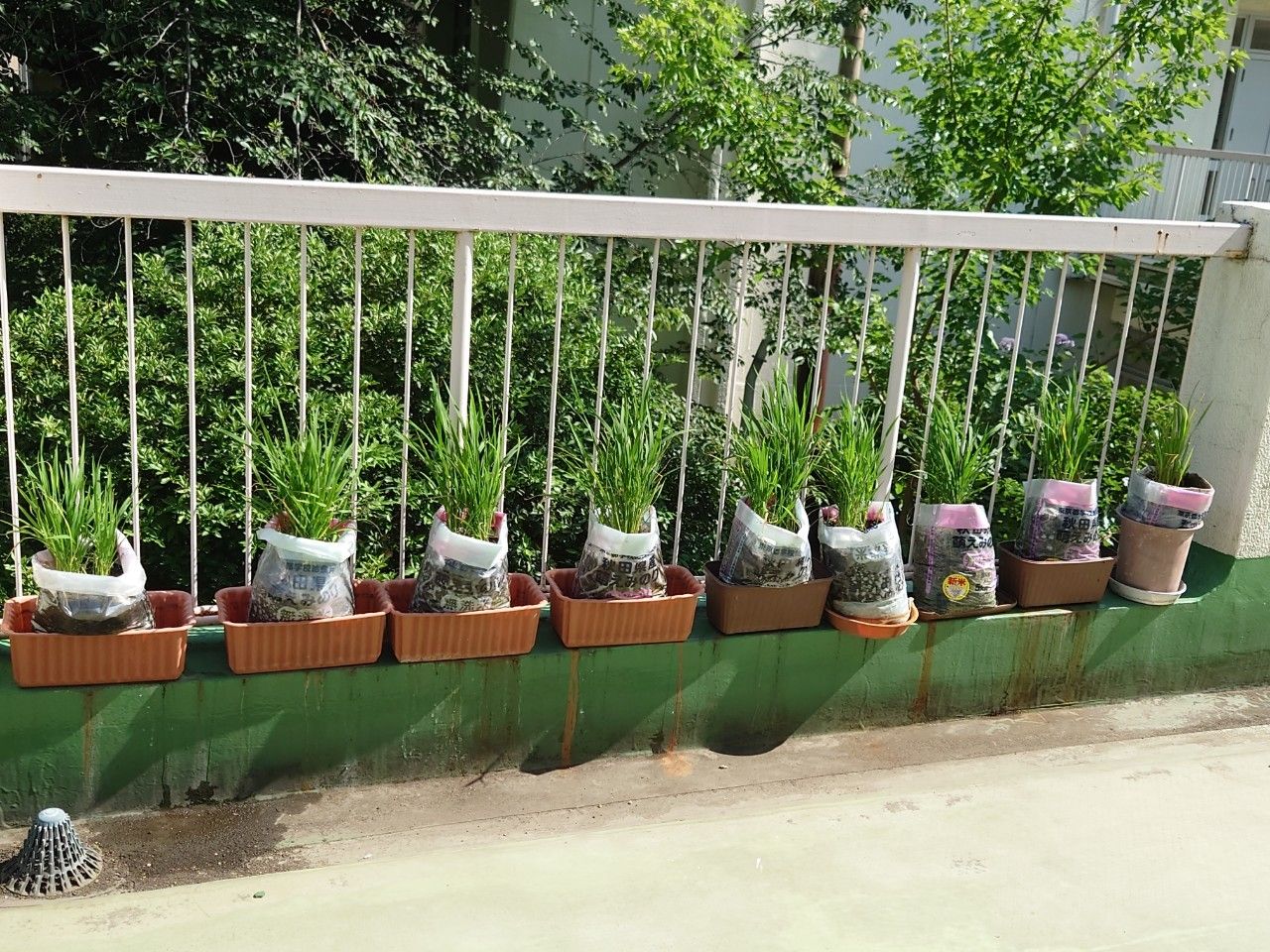 ・給食で使用した米袋の内側に新聞紙を一周して、その中に土を入れます。 ・5㎏の米袋はイチゴなどを植え、ベランダ等の手すりに落ちないように設置します。10㎏の米袋はサツマイモ、ジャガイモ、稲、スイカ、カボチャ、キュウリ、トマト、ニンジンなど育てることができます。 *米袋の内側に新聞紙をセットするのは、光が入らないようにするためです。 |