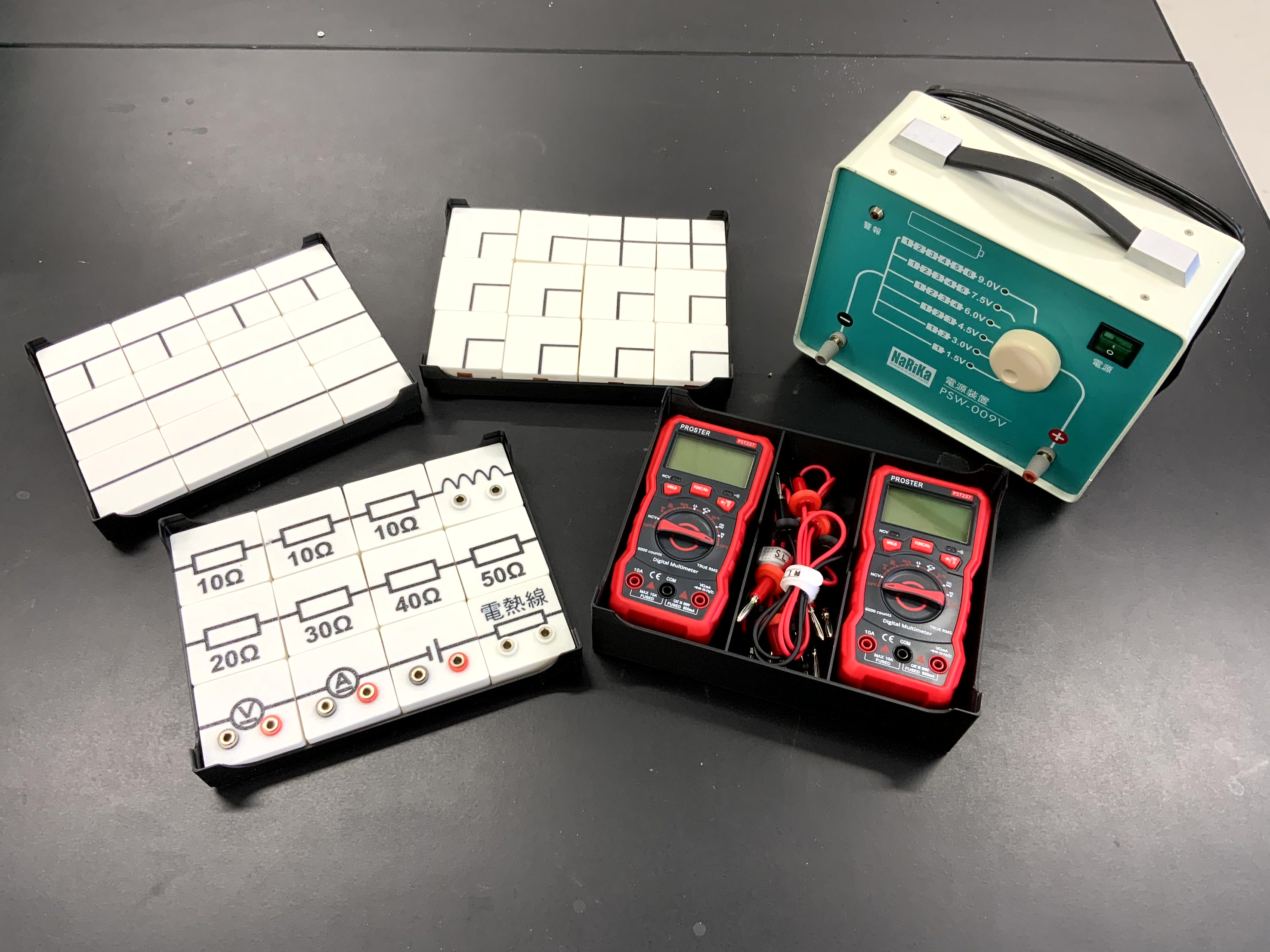 ・電源や電流計・電圧計などは市販品を使用している ・本教材は3Dプリンタでブロック本体を出力し,1cm四方にカットした銅薄板に電極をはんだ付けしたもの及び小さいネオジム磁石を取り付けて作成した ※ 3Dプリンタ用データおよび作成方法が必要な場合は,お問い合わせください(お問い合わせ先:特別支援教育連携推進グループ)。 |