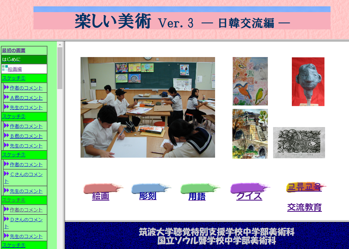 聴覚特別支援学校(聾学校)では個々がもつことばの力の習熟度が違い、鑑賞学習の深化を期待できにくい実態がある。 「生徒作品を活用した美術鑑賞用ソフト-楽しい美術-」は、聴覚特別支援学校(聾学校)に特徴的に見られるこうした問題を、視覚的指導法を手がかりに解決することを意図して開発された鑑賞学習用の補助教材である。作品画像と同時に提示されるコメント(書き言葉)や「美術用語」の解説を読むことで言語力を補い、ことばによる鑑賞学習の円滑な進行と学習内容の理解に一定の効果を上げることができる。 |