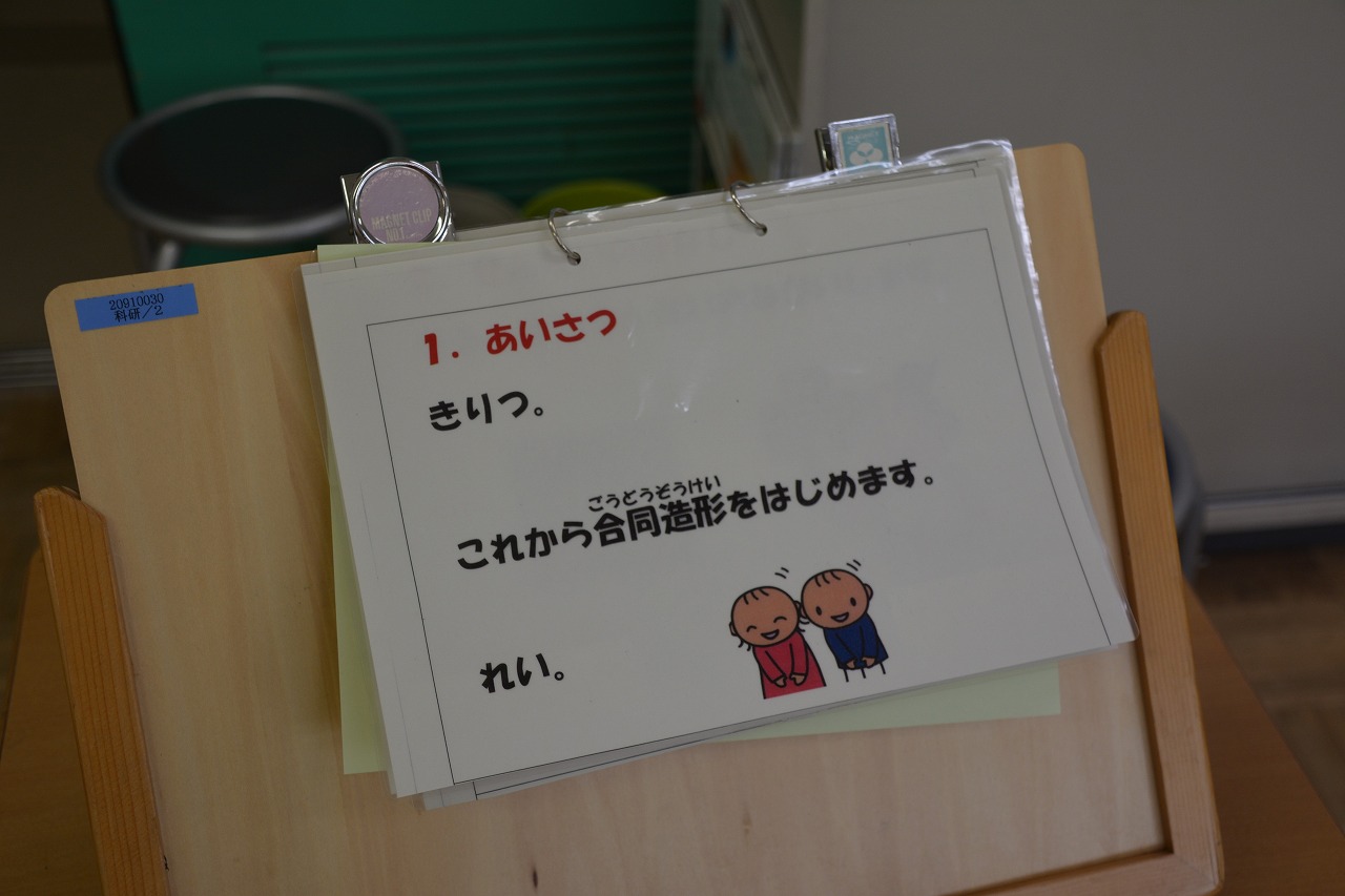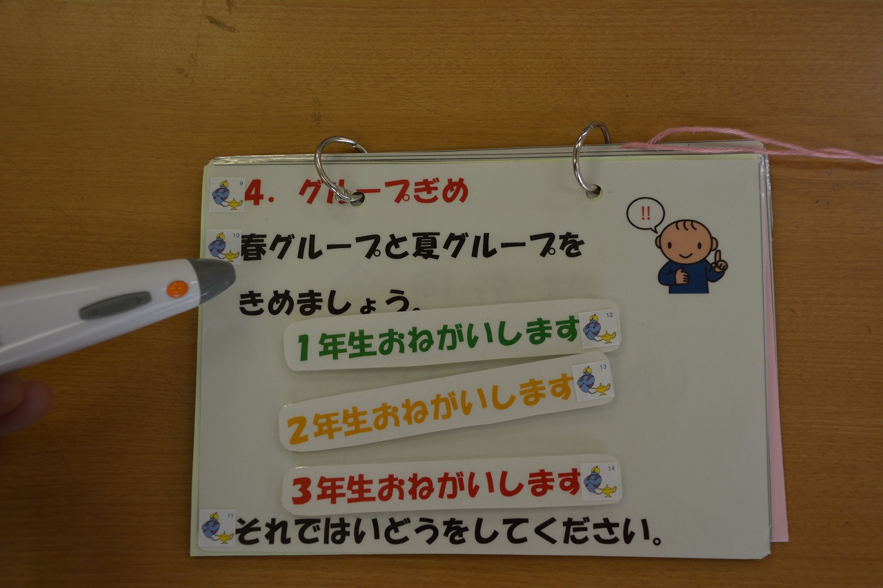 ・合同での造形活動において全体会の司会進行で音声ペンを使用した。 ・自分たちで進行していく。 ・グループ決めなどはマジックテープで張替えができるようにし、毎回決める学年の順番を変えられるように工夫した。 ・録音の際に、さまざまな先生の声を入れたり、効果音をいれたり楽しめるように配慮した。 <全体会の流れ> ①あいさつ②先生の話③名人の話④グループ決め |