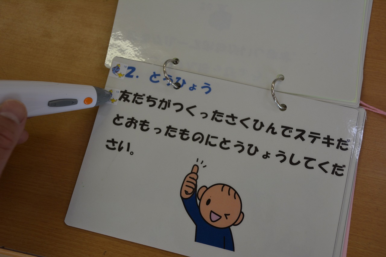 ※音声ペンは「G-Talk(グリッドマーク社)」のものを使用 ※音声ペンシールは大妻女子大学生田茂研究室で作成したものを使用 ・音声ペンでの進行と同時に同じ絵柄のめくり用カードを用意し、斜面版を利用して全体にも提示した。 ・視覚支援シンボル集「ドロップス」のイラストを使用。 |